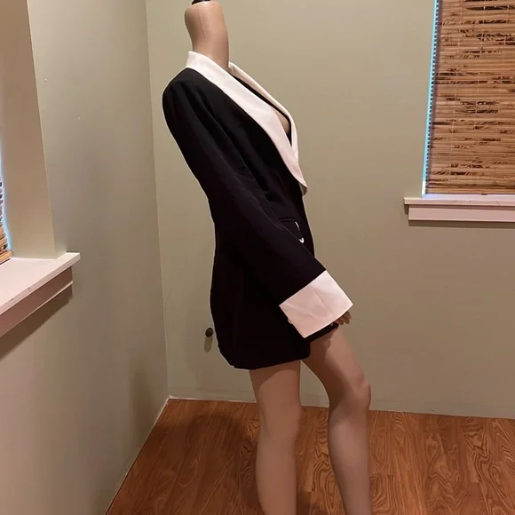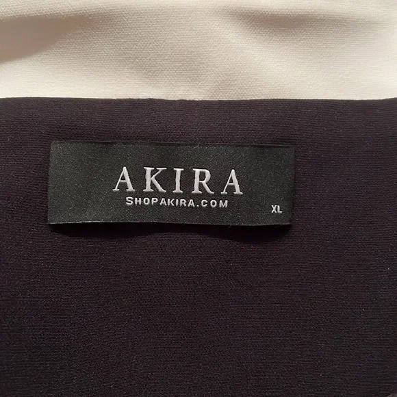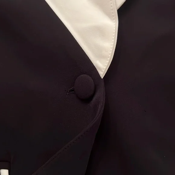 Akira Black Tuxedo Jacket With White Trim And Single Button Closure Size XLblack and white92% polyester 8% spandexfront pockets single button closure linedbutton cuffs20" armpit to armpit 25" sleeve 32" length excellent condition