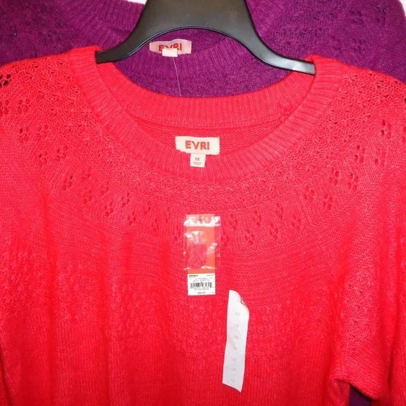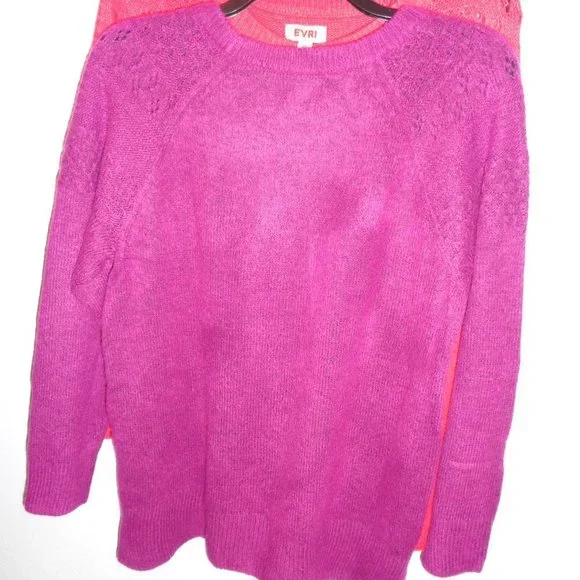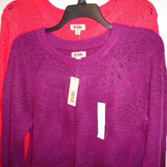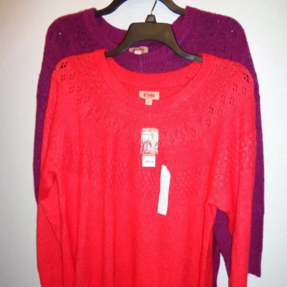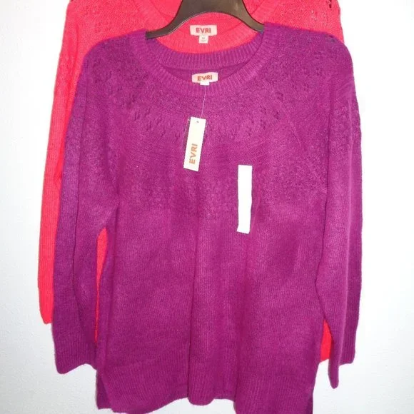 Hello :)Up for sale is a bundle lot of 2 Plus Size EVRI Crewneck Pointelle SweateraSize 1XNWT70% acrylic 30% nylonApproximate measurements: armpit to armpit 24"top to bottom 30"Sweaters are the same style, just different colors. (stockpb25/b123)