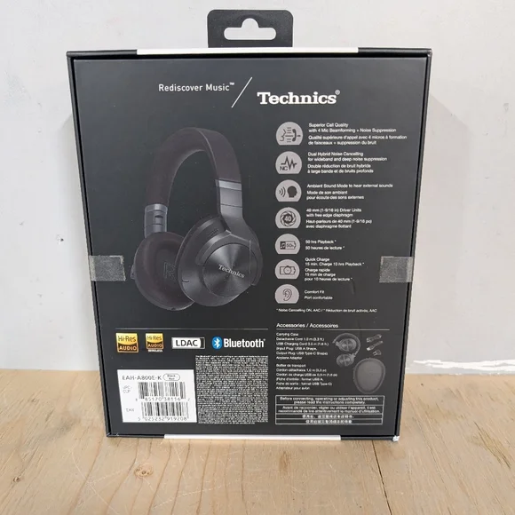 Brand new, factory sealed Technics A800 noise-canceling, wireless headphones.Model EAH-A800E-K.Black in color.Backed by Technics legendary sound quality, EAH-A800 headphones feature superior audio, exceptional over-the-ear comfort, and sparkling call clarity for home, work, and travel. Unleash a true high-fidelity sound experience in comfortable headphones.A clear, immersive sound experience with a sense of range and depth. The PEEK/Polyurethane 3-Layer Diaphragm 40mm driver lets you lose yourself in smooth, detailed highlights and bass. LDAC™ high resolution wireless audio* for uncompromised sound quality.With 8 distinct mics and advanced wind noise reduction, EAH-A800 transmits your voice clearly on each call; 4 Mic Beamforming and Noise Suppression* Technology isolates and amplifies words while minimizing surrounding noise.With industry-leading* noise cancelling, EAH-A800 combines Dual Hybrid feedforward & feedback noise cancelling with analog & digital processing for immersive listening.Driver Unit (mm) 40 mm (1-9/16 in)Sensitivity 105 dB/mW @1kHzFrequency Response (Power ON) 4 Hz -40k HzMic Monaural, MEMS MicPlayback Time with Battery (LDAC) Approx. 40 hours (NC ON) Approx. 50 hours (NC OFF)Playback Time with Battery (AAC) Approx. 50 hours (NC ON) Approx. 60 hours (NC OFF)Charging Time (25°C/ 77°F) Approx. 3.0 hours (Using the power source 1200 mA or higher)Bluetooth® Wireless Technology Version 5.2Supported Profile A2DP, AVRCP, HSP, HFP
